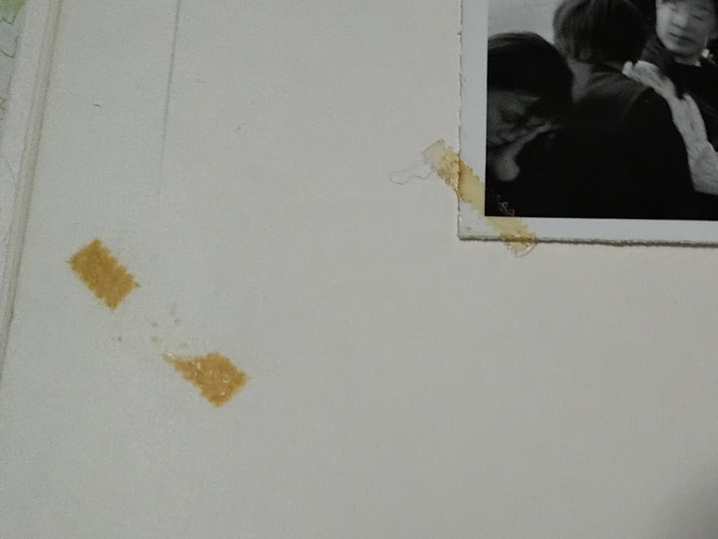 写真にはセロテープが付いたままで外れ、アルバムにはセロテープの粘着部分が変色して残っていました。